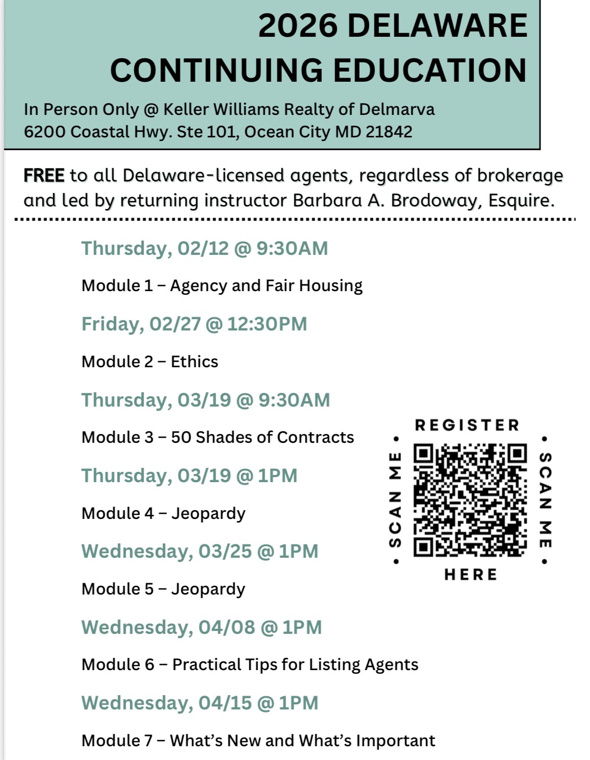 Module 1: Agency and Fair Housing Thursday, February 12, 2026 9:30 AM 9:30 AM Keller Williams Realty of Delmarva 6200 Coastal Highway Ocean City, MD, 21842 United States (map) Google Calendar ICS Register Here